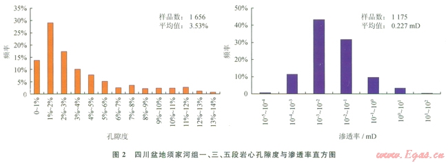 須三段儲集巖有砂巖、礫巖2種類型。砂巖儲層幾乎在全盆地均有分布,儲層孔隙度平均為4.43%,平均滲透率為0.25mD。以中壩地區(qū)物性最好,儲集巖主要為中粒巖屑石英砂巖、長石石英砂巖及巖屑砂巖,巖心平均孔隙度達7.52%,平均滲透率為0.3mD,粒間溶孔和粒內(nèi)溶孔發(fā)育。礫巖儲層僅分布在川西北劍閣地區(qū),礫石成分以碳酸鹽巖為主,礫間充填砂質(zhì),孔隙主要發(fā)育于基質(zhì)砂巖,孔隙度較低,主要分布在2%~4%。巖心與薄片觀察,裂縫發(fā)育,有時呈組出現(xiàn)或呈網(wǎng)狀,發(fā)育的裂縫溝通了低孔隙度礫巖儲層,改善了儲層的滲透性,孔隙與裂縫組成礫巖儲層儲集空間,形成“有效儲滲體” [15]。目前該區(qū)勘探發(fā)現(xiàn)多口工業(yè)氣井,表明孔隙度為2%~4%的砂礫巖,只要有裂縫的溝通,仍然可以形成有效儲層。平面上,儲層主要分布在川西地區(qū),以川西北劍閣—中壩地區(qū)最為發(fā)育,儲層厚度超過15m。