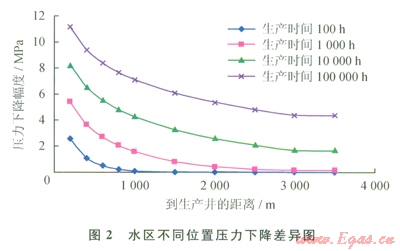 通過理論計算能了解水區(qū)不同位置壓力下降幅度的差異。圖2展示的是一個理論計算結(jié)果,儲層滲透率為10mD,裂縫發(fā)育帶水侵通道寬度為1000 m,水侵速度為l000m3/a。從圖2可看出,只要觀察井離生產(chǎn)井足夠遠,其井底靜壓力基本能代表水區(qū)平均地層壓力。否則,需要根據(jù)類似于式(5)的計算模型推算離生產(chǎn)井更遠處的靜壓力。由于滲透性較好的氣藏開發(fā)井距通常都大于lkm,圖2顯示在這種條件下壓差與觀測點到生產(chǎn)井的距離大體呈線性關(guān)系,近似直線段的斜率與滲透率、水侵速度等相關(guān)。根據(jù)這種認(rèn)識,可基于少量的理論計算得到近似的經(jīng)驗關(guān)系式,在觀察井實測靜壓力基礎(chǔ)上作修正,從而獲得更好的代表水區(qū)平均地層壓力的數(shù)據(jù)。
