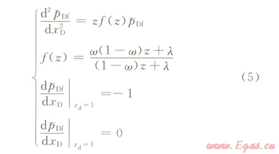 式中z為與滲流數(shù)學(xué)模型無因次時間相對應(yīng)的拉普拉斯空間自變量;`RDF為拉普拉斯空間中儲層裂縫系統(tǒng)無因次壓力;w為裂縫—孔隙雙重介質(zhì)儲層的儲容比,無因次;l為裂縫—孔隙雙重介質(zhì)儲層的竄流系數(shù),無因次;f(z)為綜合描述裂縫系統(tǒng)和孔隙系統(tǒng)儲滲級差關(guān)系的函數(shù)值,無因次;xD如為研究單向線性滲流問題的一維坐標(biāo)系中無因次坐標(biāo)值,設(shè)定氣水區(qū)交界處xD=0,水區(qū)外邊界處xD=l。