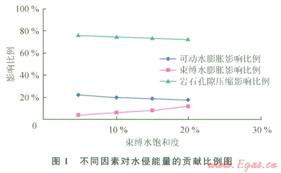 為了定量認(rèn)識前述3種岡素對水侵能量的影響程度,參照開展過相關(guān)研究的實際氣藏情況,計算預(yù)測不同束縛水飽和度條件下地層壓力從原始狀態(tài)的60MPa降到l0MPa后可動水彈性膨脹、束縛水膨脹及儲層孔隙壓縮引起的體積變化在水區(qū)總體積變化巾所占比例(圖1)。結(jié)果顯示,地層壓力降低后儲層孔隙壓縮效應(yīng)對水侵能量的貢獻比例最高,因此依據(jù)式(3)可得到估算極限水侵量在可動水體儲量中所占比例的近似公式。