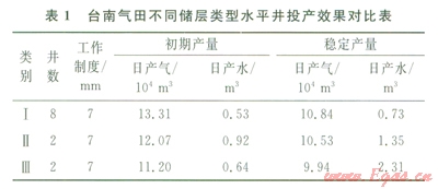 臺南氣田3種不同級別產(chǎn)層的水平井,投產(chǎn)初期日產(chǎn)能力相差不大,且產(chǎn)水量較低。對比分析一段時間之后的生產(chǎn)情況,存在Ⅰ類儲層開發(fā)效果好于Ⅱ類,Ⅱ類儲層又好于Ⅲ類和Ⅱ+Ⅲ過渡類儲層。水平井經(jīng)過一段時間的采氣生產(chǎn),雖然產(chǎn)量變化不大,但是除Ⅰ類產(chǎn)層之外,其他低級別類型的產(chǎn)層水平井日出水量均大于1m3,說明儲層類型級別越低,儲層其泥質(zhì)含量越高、含水飽和度越大,當(dāng)目的層壓力逐步降低時,束縛水變?yōu)榭蓜铀?,?dǎo)致氣井出水量增加(表1)。