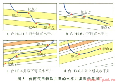 臺南氣田整體開發(fā)建產(chǎn)期間共完成水平井43口中,總進(jìn)尺9.25×104m,水平段長104~1019m,水平段鉆遇氣層平均長度623.5m,氣層平均鉆遇率92.12%,完井方式均采用篩管完井。為提高氣層動用個數(shù),實(shí)施特殊井型水平井11口,其中水平段為雙臺階的4口、雙下彎式的1口、下壓式的5口井、微上翹式的1口,氣層平均鉆遇率為94.8%。