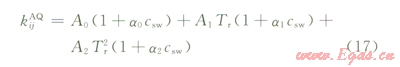 2)對(duì)混合規(guī)則作出改進(jìn),非水相和水相分別采用兩套不同的二元交互作用系數(shù)。非水相中的烴水交互作用系數(shù)采用擬合的固定值;水相中的烴—水交互作用系數(shù)(kijAQ)作為烴組分偏心因子(w)、對(duì)比溫度(Tr)和礦化度(csw)的函數(shù),即