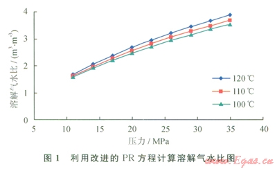利用改進(jìn)的PR方程結(jié)合相平衡模型計(jì)算不同溫度、壓力條件下的溶解氣水比(圖1)。