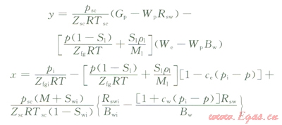 注意到x和y均為壓力的函數(shù),不同壓力下的數(shù)據(jù)點(diǎn)在y—x坐標(biāo)圖中應(yīng)位于同一直線(xiàn)上,直線(xiàn)的斜率即原始烴類(lèi)孔隙體積。計(jì)算過(guò)程中可采用試算法確定部分未知項(xiàng)。包含自由氣與水溶氣的總儲(chǔ)量為: