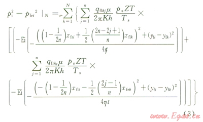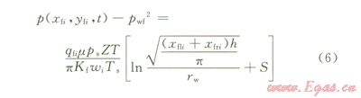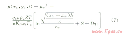 第i條裂縫就可以看成是一個(gè)以流動(dòng)半徑為Ri,厚度為裂縫寬度wi,邊界壓力為裂縫尖端壓力p(xfi,yfi,t),滲透率為Kf,流壓pwf的微型氣藏,其流動(dòng)方式可以看成徑向流,所以氣體在裂縫內(nèi)的流動(dòng)過(guò)程可表示為: