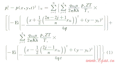 式中pi為原始地層壓力,Pa;p(x,y,t)為地層中點(diǎn)(x,y)在t時(shí)刻的壓力,Pa;qflij為第i條裂縫左端第j段的產(chǎn)量,m3/s;xfli、xfri分別為第i條裂縫左、右翼的長(zhǎng)度,m;ps為地面標(biāo)況下的壓力,Pa;Z為偏差因子;m為氣體黏度,Pa·S;K為地層滲透率,m2;h為產(chǎn)層厚度,m;t為滲流時(shí)間,s;T為地層溫度,K;ts為地面標(biāo)準(zhǔn)溫度,K;h為導(dǎo)壓系數(shù);yfi為第i條裂縫y方向坐標(biāo)。