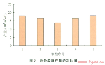 由圖3可以看出:水平氣井端部裂縫(1號(hào)和5號(hào)裂縫)的產(chǎn)量最高,中部裂縫(2號(hào)和4號(hào)裂縫)產(chǎn)量其次,中心裂縫(3號(hào)裂縫)產(chǎn)量最低。這是由于多裂縫之間干擾相互疊加影響的結(jié)果,水平氣井端部裂縫受到的干擾最小,而中心裂縫受到的干擾最大。與不考慮高速紊流(非達(dá)西流動(dòng))時(shí)的產(chǎn)量變化規(guī)律相似。