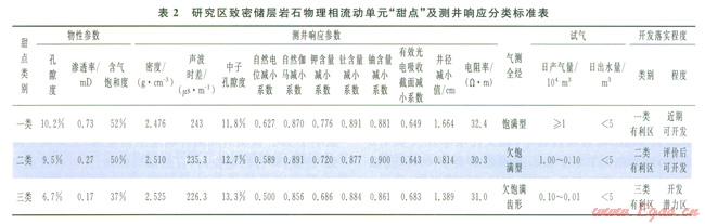 巖石物理相流動單元“甜點(diǎn)”研究在致密儲層開發(fā)中具有十分重要意義,一般致密氣層、差氣層主要富集于一、二類流動單元內(nèi),氣顯示層則賦存于分隔體中。研究分隔屏障的主要問題是要在剖面上將其劃分出來,即對相應(yīng)儲集體進(jìn)行細(xì)分巖石物理相流動單元,并盡可能描述出最小一級分隔體。為此,在該區(qū)致密儲層含氣有利區(qū)分布及非均質(zhì)特征研究中,精細(xì)地表征儲層性質(zhì)、分布及其對天然氣滲流的影響,結(jié)合巖石物理相流動單元“甜點(diǎn)”儲層特征與測井響應(yīng)(含氣測全烴)特征,把該區(qū)巖石物理相流動單元“甜點(diǎn)”劃分為一、二、三類,即按滲流、儲集和含氣“甜點(diǎn)”控制能力及測井響應(yīng)特征分為近期可開發(fā)(一類)、評價(jià)后可開發(fā)(二類)及勘探開發(fā)潛力區(qū)(三類)等三類含氣有利區(qū)(表2)。