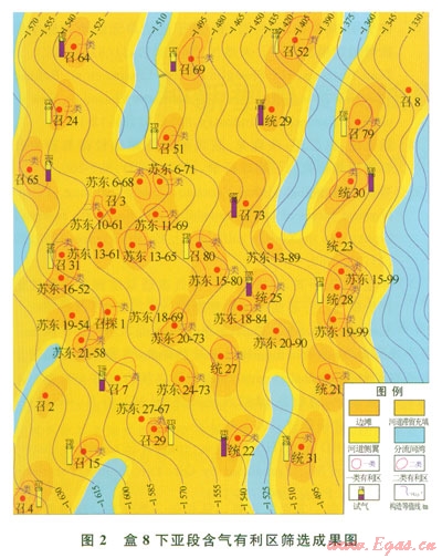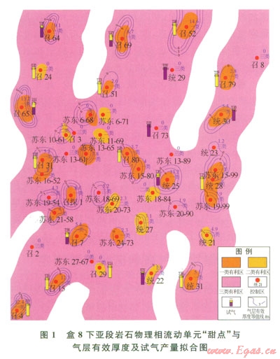2)選用反映致密儲層滲流特征的流動層帶指標(biāo)、儲能參數(shù)、單滲砂層能量厚度、氣層有效厚度、含氣層厚度、滲透率、孔隙度、含氣飽和度等多種參數(shù),利用灰色理論從不同角度對儲層滲流、儲集及含氣特征進(jìn)行全面分析,分別據(jù)一、二類巖石物理相流動單元“甜點(diǎn)”圈定出近期可開發(fā)或評價(jià)后可開發(fā)的含氣有利區(qū)97個,集中地反映出研究區(qū)致密儲層含氣有利區(qū)的分布規(guī)律、延伸方向及非均質(zhì)分布特征。