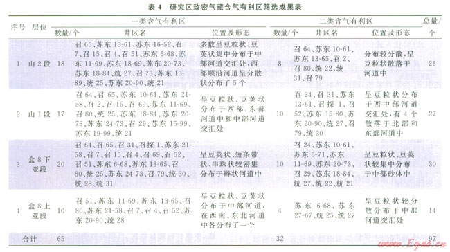 通過上述山2段、山1段、盒8下亞段、盒8上亞段主要含氣目的層段含氣有利區(qū)分析預(yù)測,分別層位篩選并劃分出一類、二類含氣有利區(qū)氣藏97個,其中在山2段篩選圈定26個,山1段圈定27個,盒8下亞段圈定30個,盒8上亞段圈定14個(表4)。這些含氣有利區(qū)處于十分有利的沉積成巖儲集相帶及其含氣圈閉和含氣富集條件下,測井解釋具有明顯較好的儲集、滲流和含氣特征,測井綜合評價(jià)為一、二類巖石物理相流動單元“甜點(diǎn)”,試氣具有工業(yè)氣流或較高產(chǎn)量,為該區(qū)致密氣藏儲層增儲上產(chǎn)提供有利目標(biāo)和井區(qū)(圖1、2)。