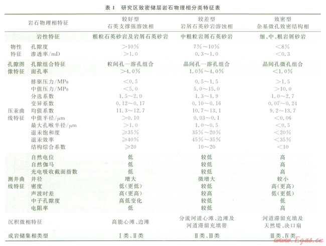 分析該區(qū)致密儲層巖石物理相和測井響應(yīng)特征的結(jié)果表明,巖石物理相分類集中體現(xiàn)m儲層巖性、物性、孔隙類型、孔隙結(jié)構(gòu)和測井響應(yīng)對儲層巖石物理相的控制作用,巖石物理相分類的測井儲層參數(shù)模式則主要是通過規(guī)則化處理孔隙流體影響。岡此,儲層巖石物理相是控制致密儲層“四性”關(guān)系和測井響應(yīng)特征的主導(dǎo)因素[6-8]。特別在其普遍存在早一中成巖期強(qiáng)烈的壓實(shí)壓溶及膠結(jié)作用,使得致密儲層原生孔隙損耗嚴(yán)重,大大改變了儲層原始孔隙結(jié)構(gòu),形成了以成巖溶孔為主、多孔隙類型共存的混合型致密氣儲集特征。儲層中大部分孔隙被限制性喉道所控制,造成儲層退汞效率低,難采體積大。為此,依據(jù)上述致密儲層巖石物理相形成的地質(zhì)條件,分析該區(qū)目的層段致密儲層沉積、成巖作用和巖性、物性、孔隙類型、孔隙結(jié)構(gòu)及測井響應(yīng)特征,在研究區(qū)劃分出較好型、較差型、致密型的一、二、三類巖石物理相類型[9-11](表1)。