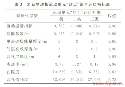 儲能參數(shù)是每口井在儲量計(jì)算取值層段內(nèi)有效厚度、有效孔隙度和含氣飽和度的乘積,它反映了儲層中純氣層厚度;單滲砂層能量厚度代表小層骨架砂體及其微相帶的沉積能量;氣層有效厚度反映達(dá)到工業(yè)氣流下限標(biāo)準(zhǔn)的氣層;含氣層厚度反映氣層、差氣層及氣顯示層厚度;滲透率、孔隙度、含氣飽和度反映儲層物性特征。這些參數(shù)從不同角度顯示該區(qū)儲層滲流、儲集及含氣“甜點(diǎn)”等巖石物理相流動單元特征,采用灰色分析方法具體研究每類巖石物理相評價(jià)參數(shù)的界面以確定不同類別評價(jià)參數(shù)界限值,通過統(tǒng)計(jì)確定參數(shù)對不同類型巖石物理相的分布標(biāo)準(zhǔn),并利用參數(shù)指標(biāo)準(zhǔn)確率與分辨率的組合分析,對各項(xiàng)參數(shù)賦予不同權(quán)值[16-17]。從而,根據(jù)氣田具體地質(zhì)特征進(jìn)行參數(shù)統(tǒng)計(jì)分析與調(diào)整,建立起研究區(qū)目的層段致密氣藏儲層巖石物理相流動單元“甜點(diǎn)”綜合評價(jià)參數(shù)指標(biāo)和權(quán)值(表3)。