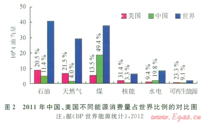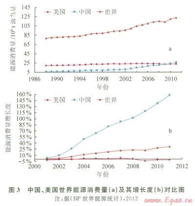 中國社會經(jīng)濟持續(xù)高速發(fā)展,能源需求量屢創(chuàng)新高。2011年中國一次能源生產總量為2 446.1×106t油當量,一次能源消費量為2613.2×106t油當量[3]。2000—2011年世界平均能源消費量增長為31.2%,而中國能源消費量則增長了158.6%,占世界總能源消費增長量的21.3%,超過了美國等發(fā)達國家(圖3)。但中國能源資源量仍非常低,尤其是人均油氣資源量僅占世界平均水平的6%。中國1993年首次成為石油凈進口國,2006年天然氣也跨人凈進口國之列[5]。中國石油對外依存度由l993年的l.2%飆升到2011年的58%,天然氣對外依存度由2006年的0.8%迅速攀升至2011年的23%,成為全球能源市場中最重要的進口國。在天然氣需求中,近年來(2006 2011年)盡管中國的天然氣產量每年平均增長l3%以上,成為全球天然氣產量增長最快的國家之一,但總量還是非常少的。2011年中國天然氣產量為1025×108m3,天然氣消費量同期年均增長量超過18%,2011年中國天然氣消費量達1307×108m3。據(jù)預測,到2020年中國天然氣年均消費量仍將以19%的復合年增長率遞增,在中國能源結構中的比例將由2011年的5%提高到l0%~l 5%,而屆時中國天然氣產量僅為2000×108m3左右。