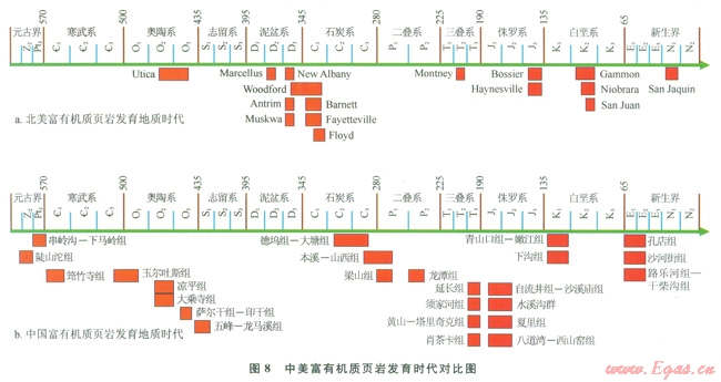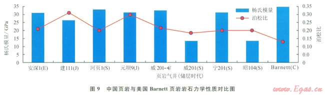 在地質特征上,作為有勘探開發(fā)遠景的含氣頁巖儲層既要有產氣潛力大的物質基礎——高質量儲層(RQ),也要是能進行有效壓裂的目標——良好的鉆完井地層(CQ)。有機質含量高的富含有機質頁巖是在特殊條件下形成的[2],這種特殊的條件使得所有頁巖氣儲層都有其獨特性(圖7) [6-7],即便是同一套頁巖儲層的地質特征在縱橫向上也往往會有非常明顯的變化。每一頁巖儲層要實現(xiàn)工業(yè)化規(guī)模開發(fā)都需要花費一定的時間對其地質特征進行認識,摸索適應的工程技術。從對比研究的結果可知,與北美地臺頁巖氣儲層相比,中國頁巖氣形成與富集地質條件非常復雜,除頁巖沉積總面積可能相當外,其他條件都相差較遠。美國產氣頁巖主要是海相沉積,而中國除海相頁巖外,還有較為發(fā)育的海陸過渡相和陸相頁巖(圖8)。美國頁巖氣主要產白上古生界一中生界,中國白元古界到新近系都有頁巖發(fā)育[1]。美國頁巖熱(R。)為1.0%~3.5%,處在生氣高峰期,中國海相頁巖R。為2.3%~5.1%,為高——過成熟熱裂解成氣階段,陸相頁巖R。為0.4%~l.2%,處于低熟一成熟階段,以生油為主,局部生氣。北美地臺構造穩(wěn)定,斷裂少,頁巖自沉積、成巖、成氣以來,除有一定抬升外,很少有大的構造改造,中國構造背景總體處在活動性較強的區(qū)域,斷裂發(fā)育,大部分頁巖都經(jīng)歷了強烈的后期多次改造,南方海相頁巖大面積出露。另外,從圖9中可明顯看出,中國頁巖儲層楊氏模量較低、泊松比高,巖石脆性指數(shù)低于美國頁巖儲層,可壓性差。