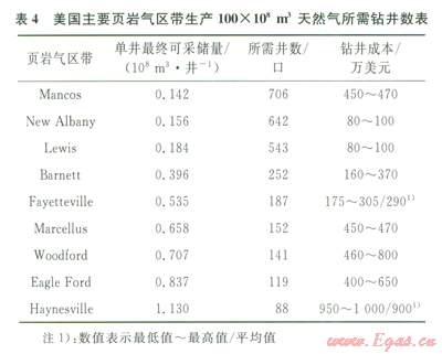 頁巖氣井生產具有單井產量低、遞減快等顯著特征,需要大量鉆井才能實現(xiàn)頁巖氣規(guī)模產量與穩(wěn)產(表4)。因此,頁巖氣勘探開發(fā)投資巨大,成本高,一般企業(yè)承擔不了如此巨大的投入風險。美國的頁巖氣勘探開發(fā)是在較為完善的天然氣管網(wǎng)和發(fā)育的消費市場基礎上,不斷改善技術、優(yōu)化作業(yè)流程、降低成本,才使其勘探開發(fā)成本明顯偏高,短期內根本無利可圖。四川盆地頁巖氣勘探開發(fā)試驗區(qū)統(tǒng)計結果表明,目前該試驗區(qū)頁巖氣水平井所需費用均超過4000萬元(人民幣),有的甚至達到7000萬元(人民幣),單井頁巖氣產量僅1.0×104~15.0×104m3/a,單井可采儲量為0.2×108~0.5×108m3,其虧損明顯。況且中國頁巖的賦存地質條件比美國復雜,頁巖氣勘探開發(fā)成本本身就可能會高于美國。
