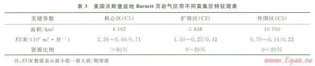 更為重要的是每一個成功的頁巖氣田從發(fā)現(xiàn)到工業(yè)化規(guī)模開發(fā)都需要經(jīng)歷“點上發(fā)現(xiàn)、面上評價、落實核心區(qū)、拓展規(guī)模開發(fā)”4個階段。與常規(guī)油氣資源勘探開發(fā)不同,頁巖氣首先是在遠景區(qū)帶評選的基礎上,通過l~2口或更多一點的鉆井工作,驗證貞巖氣的存在,實現(xiàn)點上發(fā)現(xiàn);再以數(shù)口至數(shù)10口評價井鉆探,對整個頁巖氣區(qū)帶開展面上評價,落實資源規(guī)模,分析資源分布規(guī)律,劃分不同資源豐度富集區(qū);隨后進行富集區(qū)綜合評價,開展先導試驗井鉆探,評價單井產能,總結高產富集規(guī)律,確定核心區(qū);最后以核心區(qū)為重點,實現(xiàn)工業(yè)化規(guī)模開發(fā),以此為基礎逐漸拓展,最終實現(xiàn)頁巖氣區(qū)帶整體開發(fā)。頁巖氣形成與富集機理特殊,一般大面積連續(xù)分布,資源富集程度總體較低,核心區(qū)為資源相對富集區(qū)。一個頁巖氣區(qū)帶中,核心區(qū)范圍不大,但所擁有的資源可占整個頁巖氣區(qū)帶的60%以上[6-7](表3),單井最終可采儲量(EUR)高,核心區(qū)內的頁巖氣井中的干井、低產井比例不足4%。因此,核心區(qū)的確定成為一個頁巖氣區(qū)帶成功的關鍵。中國頁巖氣勘探開發(fā)處于起步階段,資源潛力尚未完全落實,遠景頁巖氣區(qū)帶尚未確定,核心區(qū)的確定目前更無從談起。