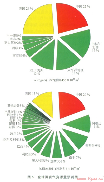 頁巖氣在中國雖顯些許陌生,但目前在中國陸上已發(fā)現(xiàn)從前寒武紀到新生代均有豐富的富有機質頁巖發(fā)育(圖4)[5],初步預測中國具有豐富的頁巖氣資源量。美國學者(Rogner,1997) [6-7]、美國能源信息署(EIA,2011) [8]預測全球頁巖氣資源量為456×1012~716×1012m3 (圖4),接近或超過了全球常規(guī)天然氣資源量(471×1012m3)。其中所預測的中國頁巖氣資源量為l00×1012~l44.4×1012m3,占世界頁巖氣總資源量的20%左右(圖5)。2005年以來,中國機構或學者借鑒北美成功經(jīng)驗,加快頁巖氣地質認識,強化頁巖氣勘探開發(fā)技術攻關,通過廣泛開展中國頁巖氣地質評價與典型區(qū)塊的勘探開發(fā)先導試驗,在四川、鄂爾多斯等盆地和重慶黔江、湖南漣源等地區(qū)的頁巖氣勘探開發(fā)中相繼取得突破,證實了中國頁巖氣(資源)的廣泛存在,具良好的勘探開發(fā)前景。利用露頭地質調查、探井及實驗測試等取得的實際數(shù)據(jù),預測中國頁巖氣地質資源量為57×102~224×1012m3,技術可采資源量為10.3×1012~47×1012m3 (表1) [5]。2012年中國政府已依據(jù)中國豐富的頁巖氣資源量、勘探開發(fā)先導試驗的可喜成果,制定了雄心勃勃的《中國頁巖氣“十二五”發(fā)展規(guī)劃》:2015年中國頁巖氣產量達到65×108m3,2020年力爭實現(xiàn)頁巖氣產量600×108~800×108m3[9]。
