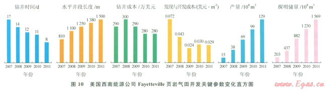 頁巖氣本身是潔凈能源,毋庸置疑,但頁巖氣在勘探開發(fā)巾會引發(fā)嚴重的環(huán)境污染問題也不應回避。美國有輿論指出頁巖氣開采已產生了明顯的環(huán)境污染,在美國的一些地方,已爆發(fā)多起抗議由頁巖氣勘探開發(fā)導致的水源污染、房屋損害等事件。歐洲因擔心頁巖氣勘探開發(fā)存在環(huán)境隱患而叫停了多個頁巖氣項目,越來越多的國家正在由于對環(huán)境的擔憂而不鼓勵頁巖氣發(fā)展[13]。頁巖氣勘探開發(fā)可能造成的環(huán)境污染包括勘探開發(fā)中大量占有土地對地表的破壞、大量鉆井液與壓裂液的用水與排放對水資源的過度使用與污染(表5)、烴類氣體遺散及其他有害物質的排放對大氣及土地等的污染。大量占有土地、鉆井液與壓裂成功實現(xiàn)了頁巖氣大規(guī)模商業(yè)性開采。據(jù)美國西南能源公司2007—2011年對Fayetteville頁巖氣區(qū)帶的開發(fā)統(tǒng)計,通過不斷的技術進步和優(yōu)化作業(yè)流程,鉆井時間減少了52%以上,水平井段長度增加了84%以上,產量、儲量均提高了7倍以上,但鉆井成本基本保持不變,發(fā)現(xiàn)和開發(fā)成本大幅度降低(圖10) [2],盡管如此,該區(qū)帶所有頁巖氣井,仍有80%處于虧損或無利可盈狀態(tài),只有20%的井有盈利狀態(tài)。中國頁巖氣勘探開發(fā)剛駛人工業(yè)化試驗發(fā)展道路,以地質評價、資源落實、技術積累為主,頁巖氣鉆井、儲層改造技術還不成熟,工具、工藝不配套,特別是施工工具、裂縫監(jiān)測等工具與技術尚需進口,同時,盡管中國的天然氣市場需求旺盛,但管網(wǎng)建設還不成熟且分布不均,使中國頁巖氣液的用水在中國將是更為嚴峻的環(huán)保挑戰(zhàn)。在中國南方地少人多、地貌以丘陵、山地為主,頁巖氣井場往往會臨近村舍,人口密集,且取水、排液主要以灌溉及飲用水源為主,這將使得頁巖氣在鉆井、儲層改造中面臨嚴峻的噪音消除、鉆井液與壓裂液處理及交通設施協(xié)調的壓力。大量土地占有,會造成地表植被破壞,大規(guī)模水力壓裂會破壞巖層穩(wěn)定性,二者并存將會增加山體滑坡發(fā)生的町能性。在中國北方,尤其是兩北地區(qū),干旱缺水現(xiàn)象較為突出,在較短的時間內消耗大量的水,會給當?shù)厝诵笥盟凸I(yè)用水帶來影響。另外,水力壓裂中大量消耗和陶粒、石英砂及KC1等也是寶貴的天然資源。