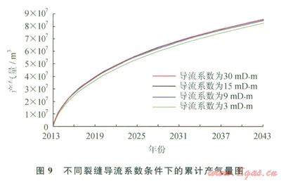 體積壓裂形成的裂縫體系是否具有經(jīng)濟效益,一個很重要的指標是裂縫的導(dǎo)流能力,因此頁巖氣藏的開發(fā)不僅僅依靠復(fù)雜的裂縫網(wǎng)絡(luò)系統(tǒng),還需要裂縫有充分的導(dǎo)流能力。圖9展示了不同裂縫導(dǎo)流系數(shù)條件下的累計產(chǎn)氣量對比情況,表7中給出了具體的累計產(chǎn)氣量,從該圖9和表7中的數(shù)據(jù)可以看出主裂縫導(dǎo)流系數(shù)對模型的采出程度有較大影響,在其他條件都相同時,提高壓裂形成主裂縫的導(dǎo)流能力,可明顯提高頁巖氣藏的采收率。這里需要指出的是,雖然增大裂縫的導(dǎo)流系數(shù),是提高采收率的途徑之一,但從圖9中可以看出,隨著導(dǎo)流系數(shù)的不斷增大,累計采氣量的增幅越來越小,對于本文中的數(shù)值模型,當裂縫導(dǎo)流系數(shù)達到9mD·m后,進一步增加裂縫的導(dǎo)流能力并不能顯著地提高氣藏的采出程度。