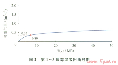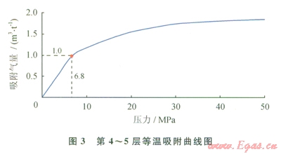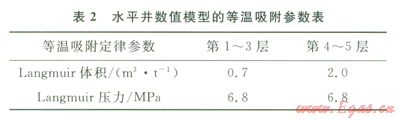 模型中吸附氣的解吸遵循Langmuir等溫吸附定律(表2),縱向上由頂?shù)降祝?span lang="EN-US">l~3層的等溫吸附曲線見圖2,第4~5層的等溫吸附曲線見圖3。模型的儲量為9.92×108m3,總含氣量為2.57m3/t,其中游離氣占總含氣量的58%,吸附氣占總含氣量的42%。