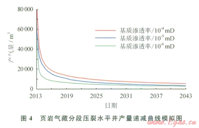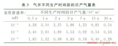 頁巖氣抬在投產(chǎn)初期產(chǎn)氣量較高但遞減迅速,后期相當長時間內(nèi)產(chǎn)量低,遞減緩慢,因此氣井的壽命比常規(guī)氣藏的氣井也要長得多。圖4中模擬了基質(zhì)滲透率分別為l×10-4mD、1×l10-5mD和1×10-6mD 3種情況下分段壓裂水平井的產(chǎn)量遞減曲線,氣井均以8×103m3的日產(chǎn)氣量投產(chǎn),井底壓力控制為3MPa,表3中給出了不同生產(chǎn)時間的日產(chǎn)氣量。從圖4和表3不難看出,頁巖氣井在生產(chǎn)初期的產(chǎn)量遞減異常顯著,根據(jù)國外的頁巖氣藏數(shù)據(jù)資料統(tǒng)計,頁巖氣井在投產(chǎn)的第1年內(nèi)產(chǎn)量遞減最高在80%以上,以后遞減逐漸減緩。