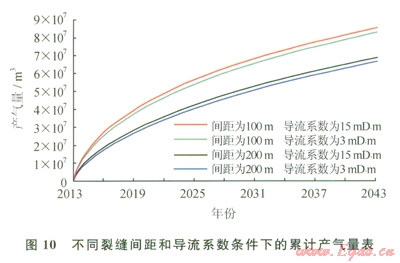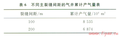 頁巖儲層的體積壓裂改造,通過多方向人丁縫裂溝通更多的天然裂縫,增加泄流面積。圖7和圖8分別模擬了不同裂縫半長和不同裂縫間距條件下的單井模型累計產(chǎn)氣量的對比情況,表5和表6分別給出了具體的累計產(chǎn)氣量。結(jié)合圖7和表5、圖8和表6可以看出,當體積壓裂形成的主裂縫較短或分段壓裂的級數(shù)較少時,增加主裂縫的長度和分段壓裂的級數(shù)都可以使累計產(chǎn)氣量顯著提高。但從模擬結(jié)果來看,當裂縫半長超過l00m后,再繼續(xù)增加裂縫的長度,累計產(chǎn)氣量的增幅越來越小,同樣隨著分段壓裂級數(shù)的增加,累計產(chǎn)氣量的增幅也是越來越小的。