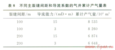 根據(jù)上述分析,只有壓裂縫具有一定的導(dǎo)流能力時,才可能成為對氣藏開發(fā)有效的裂縫,而且壓裂縫的導(dǎo)流能力越強,裂縫周圍儲層中的流體就越容易往裂縫中流動,進而流入井筒中,因此裂縫導(dǎo)流能力的強弱對于分段壓裂的級數(shù)具有重要影響。如果能夠壓裂出相對高導(dǎo)流能力的裂縫,那么高導(dǎo)流裂縫之間間距的影響就會減小。相反,如果不能壓裂出相對高導(dǎo)流裂縫,則通過增加壓裂的級數(shù)來減小主要的高導(dǎo)流裂縫間的間距也會本質(zhì)上提高產(chǎn)氣速率和氣藏采收率(圖10、表8)。另外,相對高導(dǎo)流能力的裂縫,不僅可以大幅度的提高產(chǎn)量,還可以減少壓裂的級數(shù),減少成本,提高開采的效益。