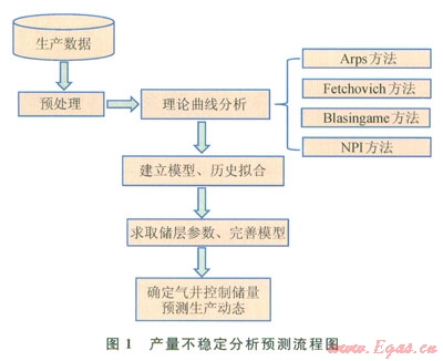隨著氣井生產(chǎn)動態(tài)分析技術(shù)的不斷發(fā)展,逐漸形成了以生產(chǎn)數(shù)據(jù)為分析對象,對氣井進行生產(chǎn)分析、評價和預測的新方法,稱為產(chǎn)量不穩(wěn)定分析法。該方法以Arps產(chǎn)量遞減分析、Fekovich曲線擬合分析、Biasingame現(xiàn)代遞減分析、NPI重整壓力積分曲線分析為基礎[10-13],綜合考慮儲滲特征、流體物性等情況,開展各種典型曲線、生產(chǎn)歷史曲線的擬合分析,不斷修正模型參數(shù),最終確定氣井生產(chǎn)動態(tài)模型,實現(xiàn)動態(tài)儲量計算和生產(chǎn)分析預測,分析流程如圖1所示。