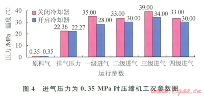 從表2的數(shù)據(jù)可看出,當(dāng)進氣壓力為0.35 MPa時開啟冷卻器后壓縮機一級進氣溫度由35℃降低到28℃,溫度下降了7℃,其他參數(shù)對比分析如圖4所示??傊诓煌M氣壓力下,開啟冷卻器后壓縮機各級進氣溫度都有所下降,對第二、四級級間回氣的冷卻取得了降低壓縮機進氣溫度的效果。