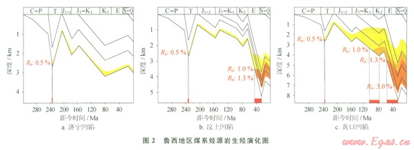 白上古生界煤系烴源巖沉積以后,因該區(qū)覆于穩(wěn)定的華北地臺之上,接受的沉積厚度相差不大(2500m左右),各地區(qū)地溫梯度基本相同,煤系烴源巖的R。達(dá)到0.5%左右,開始少量生烴。三疊紀(jì)末期受印支運(yùn)動影響,該區(qū)大規(guī)模抬升[12-15],有機(jī)質(zhì)演化得到抑制。此后,凹陷區(qū)進(jìn)入差異演化階段,導(dǎo)致地溫梯度也開始分異:黃口、成武、魚臺等凹陷因接受大規(guī)模的中生界沉積,煤系烴源巖埋深超過3500m,開始二次生烴;此時的汶上、濟(jì)寧、巨野等凹陷中生界沉積厚度較薄、埋藏較淺,烴源巖未能滿足液態(tài)烴生烴條件。