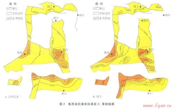 2)各凹陷烴源巖的熱演化過程有3種類型:濟(jì)寧、巨野凹陷為印支期一次生烴型,生烴能力極差,對該區(qū)煤成氣成藏貢獻(xiàn)不大;汶上凹陷為印支一喜馬拉雅山期二次生烴型,但僅局部達(dá)到二次生烴條件,生烴潛力有限;黃口、成武、魚臺等凹陷為印支一燕山期、喜馬拉雅山期二次生烴型,烴源巖大面積成熟,生烴潛力最大。