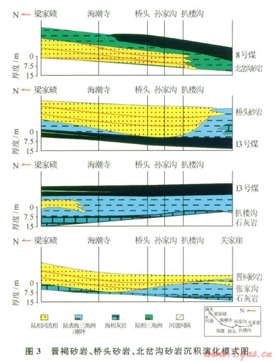 3套典型砂巖體的沉積表明了北部地勢的坳隆和沉降幅度的反復(fù)變化,也表明陸表海環(huán)境下大型河流快速侵入并持續(xù)沉積的存在。晉祠砂巖沉積時期,地勢北高南低,河流由北向南快速侵入,主干河道發(fā)育在研究區(qū)北部和中東部;隨后北部地勢沉降幅度變大,沉積的扒樓溝石灰?guī)r表明了海域中心向北的遷移,地勢也相應(yīng)南高北低;之上發(fā)育了在該區(qū)和整個鄂爾多斯盆地東緣廣泛分布的13號煤層,在13號煤層的泥炭沼澤沉積之時,北部地勢仍略低,但受廣泛的泥炭沼澤堆積影響,地勢已經(jīng)接近平緩;橋頭砂巖沉積時期的河流再次由北向南沖積,大型的河流對下部的泥炭沼澤起沖刷作用,此時地勢轉(zhuǎn)變?yōu)楸备吣系?;隨后陸表海海水的再次侵入和11號、12號煤層成煤沼澤的堆積在一定程度上又減緩了北部隆起的趨勢;北岔溝砂巖河流沉積的影響范圍較前兩次進一步擴大,往南延伸到三交、柳林地區(qū),北部地勢進一步隆起,泥炭沼澤逐漸向南轉(zhuǎn)移(圖3)。
