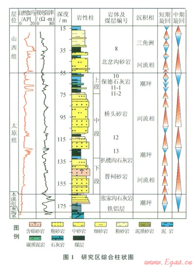 山西組以河流三角洲沉積體系為主,底界北岔溝砂巖,是一套灰白色的粗粒砂巖,與下伏地層呈整合接觸,厚度變化大,局部底部含礫,在橋頭鎮(zhèn)一帶過渡為細礫巖??梢娪缮皫r、粉砂巖、碳質(zhì)泥巖及煤層組成2~4個正粒序的沉積旋回。主采煤層為8號煤層,發(fā)育在第一旋回的上部,大部分地區(qū)穩(wěn)定可采(圖1)。