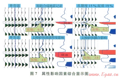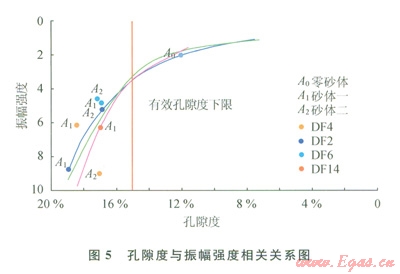 研究結(jié)果顯示(圖5),泥質(zhì)含量增加后,總孔隙度隨之降低,巖石速度及密度也應(yīng)該隨之增加。即當(dāng)儲層物性變差,儲層反射強度降低。如圖5所示,多口井測井曲線擬合趨勢基本相同。將各井實鉆儲層頂面振幅其他因素的影響剔除后,實鉆振幅值與正演模擬趨勢基本吻合。證明該規(guī)律可以代表真實物性變化條件下的地震反射變化情況。同時,該研究結(jié)果可以將地震振幅大小與物性下限(15%)相對應(yīng),當(dāng)不受調(diào)諧及其他因素影響的時候,真實氣層頂面反射振幅在3.5左右。所以對振幅強度低于3.5的區(qū)域在儲量計算時基于風(fēng)險考慮,儲量級別相應(yīng)降低。