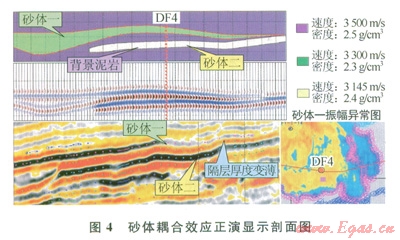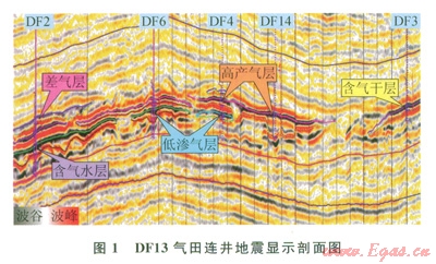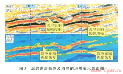 DFl3氣田平面分布達(dá)數(shù)百平方千米,儲層、蓋層橫向上變化較大。受沉積速度、厚度及壓實不均影響,泥巖蓋層的速度及密度在空間上存在較大差異。由此導(dǎo)致同一套氣層具有完全不同的地震響應(yīng)特征。當(dāng)存在致密泥巖蓋層時,致密泥巖旁瓣的波谷會與氣層頂面的波谷疊加,導(dǎo)致氣層頂面出現(xiàn)異常“亮點”;相反,當(dāng)蓋層是一套相對低阻抗泥巖時(本區(qū)蓋層阻抗均高于儲層),氣層頂面反射相應(yīng)減弱,從而導(dǎo)致對儲層含氣性的誤判。