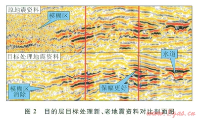 研究中消除這兩方面的影響岡素方法是:①開展地震資料目標(biāo)處理,提高地震資料的信噪比和目的層的資料相對保幅性(圖2);②改變常規(guī)反演只針對目的層段建模和反演的做法。本氣田反演從海底開始,嚴(yán)格利用所有淺層井資料開展包含淺層氣的建模,同時利用三維速度場資料來消除泥底辟區(qū)域的低速影響。通過精細(xì)目標(biāo)處理及速度約束補償反演,基本能夠消除淺層氣及泥底辟低速帶來的影響,儲層預(yù)測與深度預(yù)測與實鉆結(jié)果吻合較好。