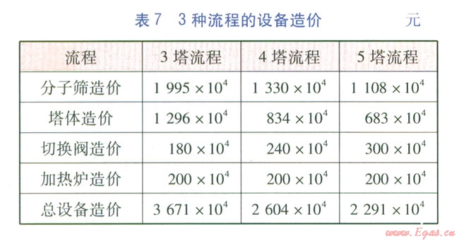 由表6、7可知,3塔流程的設(shè)備造價最高,由于塔徑較大,且塔體壁厚較大,導(dǎo)致制造難度加大,而且再生氣、燃料氣質(zhì)量流量較大,運行成本較高。因此,不考慮采用3塔流程。對于4塔、5塔流程,5塔流程的設(shè)備造價低于4塔流程,且再生氣、燃料氣質(zhì)量流量小于4塔流程,運行成本低于4塔流程。綜合分析,5塔流程的經(jīng)濟性最優(yōu)。