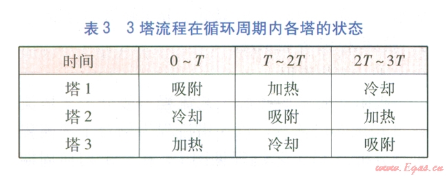 由5塔流程可知,再生氣先對已加熱再生分子篩塔進行冷卻,然后經(jīng)加熱爐升溫后對已完成吸附的分子篩塔進行加熱再生,這個過程是同時和連續(xù)的。當(dāng)對已加熱再生分子篩塔的冷卻完成后,才能進行分子篩塔的切換,我們將分子篩塔的冷卻或加熱再牛時間稱為切換周期r。將每座塔均被加熱再生、冷卻一次的時間稱為循環(huán)周期,例如對于3塔、4塔、5塔流程,循環(huán)周期分別為3T、4T、5 T。3塔、4塔、5塔流程在循環(huán)周期內(nèi)各塔的狀態(tài)分別見表3~5。