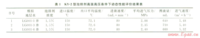 使用PP-1型高溫高壓泡沫評價裝置測定高溫高壓條件下KY-2泡排劑動態(tài)性能,其測試結(jié)果見表1。實驗數(shù)據(jù)表明在進(jìn)口溫度