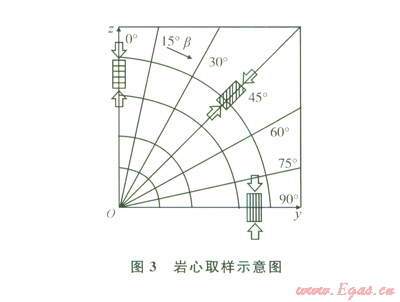 為探討層理頁(yè)巖的各向異性,按一定的β方向取樣(β角為層理而與巖樣端面問的夾角)。β角從0°~90°,每隔l5°取l個(gè)樣,共計(jì)7個(gè)樣(圖3)。巖樣上下端面的不平行度小于