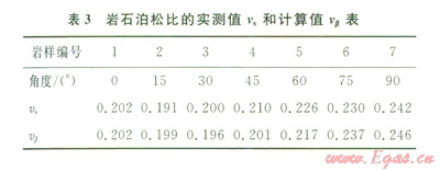 由表1的數(shù)據(jù)通過(12)計(jì)算泊松比隨角β的變化規(guī)律,泊松比的實(shí)測(cè)值和計(jì)算值結(jié)果數(shù)據(jù)見表3。