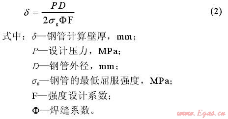 管道壁厚選取不僅要求滿足管道強(qiáng)度、穩(wěn)定性要求,同時應(yīng)滿足抗御外力破壞的要求。按照《城鎮(zhèn)燃?xì)庠O(shè)計(jì)規(guī)范》(GB50028—2006)的相關(guān)要求,直管段管壁厚度按公式(2)計(jì)算: