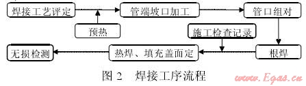 常用焊接方法有:手工電弧焊、埋弧自動焊、氬弧焊、CO2氣體保護(hù)焊、等離子弧焊、電渣焊。高壓、次高壓管道主要采用的焊接方法:焊條電弧焊上向焊(手工焊)、焊條電弧焊下向焊(手工焊)、自動保護(hù)藥芯焊絲電弧焊下向焊(半自動焊)、熔化極氣體保護(hù)電弧焊下向焊(半自動焊、機(jī)械化焊接),其焊接工序流程見圖2: