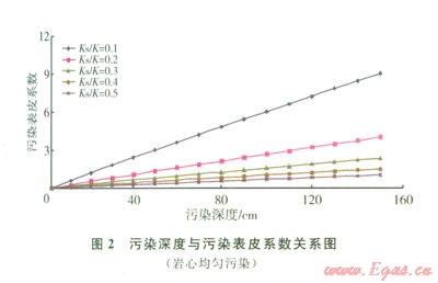 通過式(10)可以算出在不同污染深度下的表皮系數(shù)。其污染深度與污染表皮系數(shù)關(guān)系(l=1 50 cm,K=0.1 D)見圖4。從圖4可知污染表皮系數(shù)隨著污染深度的增加而增大。