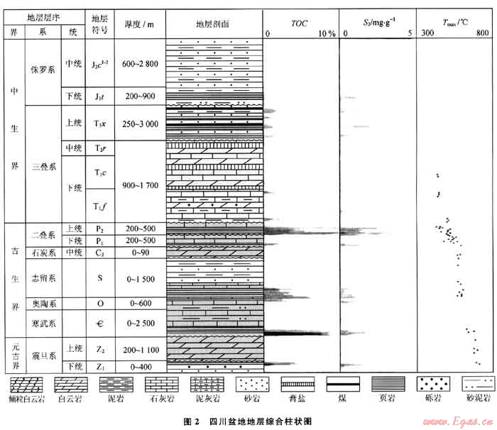 泥頁(yè)巖可形成于陸相、海相及海陸交互相沉積環(huán)境中,暗色泥頁(yè)巖主要形成于缺氧的閉塞海灣、淘湖、湖泊深水區(qū)、欠補(bǔ)償盆地及深水陸棚等沉積環(huán)境中(姜在興,2003;張愛(ài)云等,1987)。碳質(zhì)頁(yè)巖常與煤系伴生,一般出現(xiàn)在煤層的頂、底板或夾層中,以湖泊、沼澤環(huán)境沉積為主。石炭紀(jì)-二疊紀(jì)、三疊紀(jì)-侏羅紀(jì)和古近紀(jì)-新近紀(jì)為中國(guó)3次主要的成煤期,發(fā)育多套與煤層相伴生的碳質(zhì)頁(yè)巖。如中國(guó)南方地區(qū)的二疊系龍?zhí)督M(P2l)碳質(zhì)頁(yè)巖分布面積較廣,厚度介于200~300m;中國(guó)南方揚(yáng)子地塊、華北地塊及塔里木地塊古生界海相泥頁(yè)巖以深水陸棚相沉積為主,如四川盆地古生界發(fā)育多套黑色泥頁(yè)巖(圖2),寒武系筇竹寺組、志留系龍馬溪組泥頁(yè)巖為大陸邊緣坳陷的深水陸棚相沉積,厚度介于200~400m,含豐富的有機(jī)質(zhì)、筆石等海洋浮游生物化石及白生黃鐵礦等;中國(guó)陸相沉積盆地中,松遼盆地白堊系、渤海灣盆地古近系、四川盆地三疊系、鄂爾多斯盆地三疊系等發(fā)育多套湖相、湖沼相黑色泥頁(yè)巖,含豐富的介形蟲(chóng)、孢粉、細(xì)菌、高等植物等化石及有機(jī)質(zhì),厚度介于200~1500m。