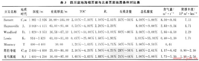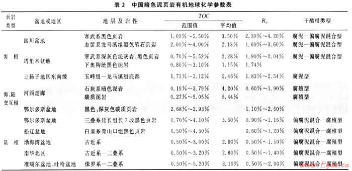 中國(guó)暗色泥頁(yè)巖分布時(shí)代多、面積較廣,就全國(guó)而言從震旦系-新近系均有分布,區(qū)域上遍及全國(guó)。從沉積環(huán)境上講,由海相一海、陸交互相-陸相均發(fā)育較厚的暗色泥頁(yè)巖。暗色泥頁(yè)巖有機(jī)質(zhì)含量、熱演化程度等指標(biāo)與美國(guó)主要暗色泥頁(yè)巖有不少相似之處(表4~6)。