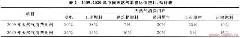 中國天然氣下游市場用戶主要集中在發(fā)電、民用、工業(yè)燃料、建筑物燃料、交通運輸燃料、工業(yè)原料等6大領(lǐng)域。2009、2020年中國天然氣消費比例統(tǒng)計、預計情況如表2所示[5]。