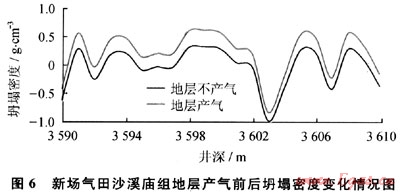 川西地區(qū)新場(chǎng)氣田利用空氣鉆井技術(shù)鉆探沙溪廟組地層時(shí),鉆遇產(chǎn)氣層段,產(chǎn)氣層短時(shí)間產(chǎn)氣后引起井下遇阻卡鉆事故,隨后被迫轉(zhuǎn)換為常規(guī)鉆井。利用前面建立的高壓產(chǎn)氣層氣體鉆井井壁穩(wěn)定性評(píng)價(jià)方法分析了新場(chǎng)氣體沙溪廟組產(chǎn)氣層段不產(chǎn)氣和產(chǎn)氣瞬間兩種情況下的坍塌密度變化情況,如圖6所示。