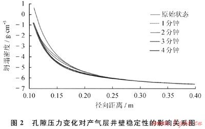 從圖2可以看出,高壓產(chǎn)氣層孔隙壓力的變化對(duì)地層井壁穩(wěn)定性的影響十分明顯。從圖2可以看出,與原始地層相比較(即地層不產(chǎn)氣,地層孔隙壓力分布保持原始狀態(tài)),高壓氣層產(chǎn)氣后,近井壁地帶孔隙壓力降低,作用在巖石骨架上的有效應(yīng)力增加,但井壁穩(wěn)定性變好。因此,高壓氣層產(chǎn)氣引起地層孔隙壓力降低有利于產(chǎn)氣層的井壁穩(wěn)定。